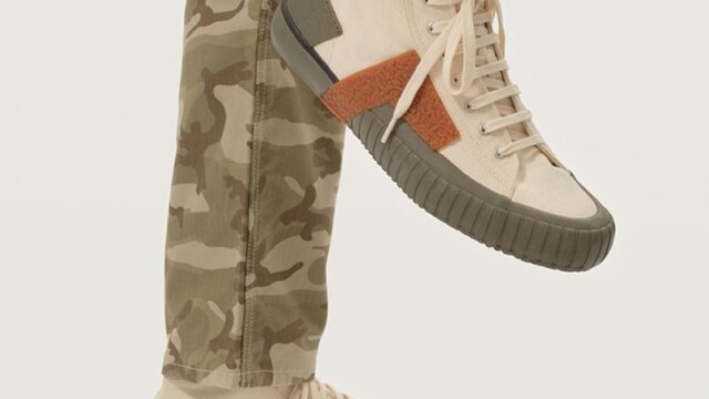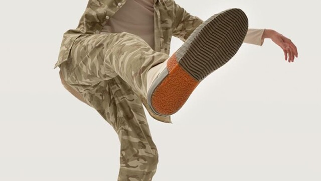 Quello che colpisce è la particolare suola ‘crepe’ che risale sopra la tomaia lateralmente con due lembi e che si incastra con il profilo della suola dando a vita a una sorta di ‘puzzle’ composto da materiali diversi che si incastrano tra loro.