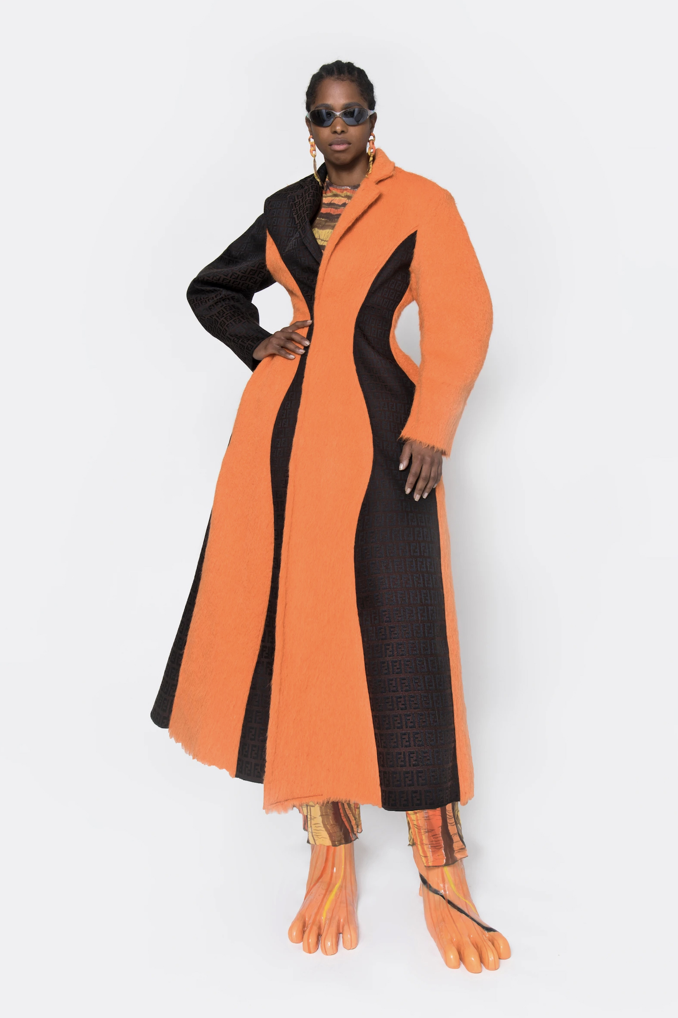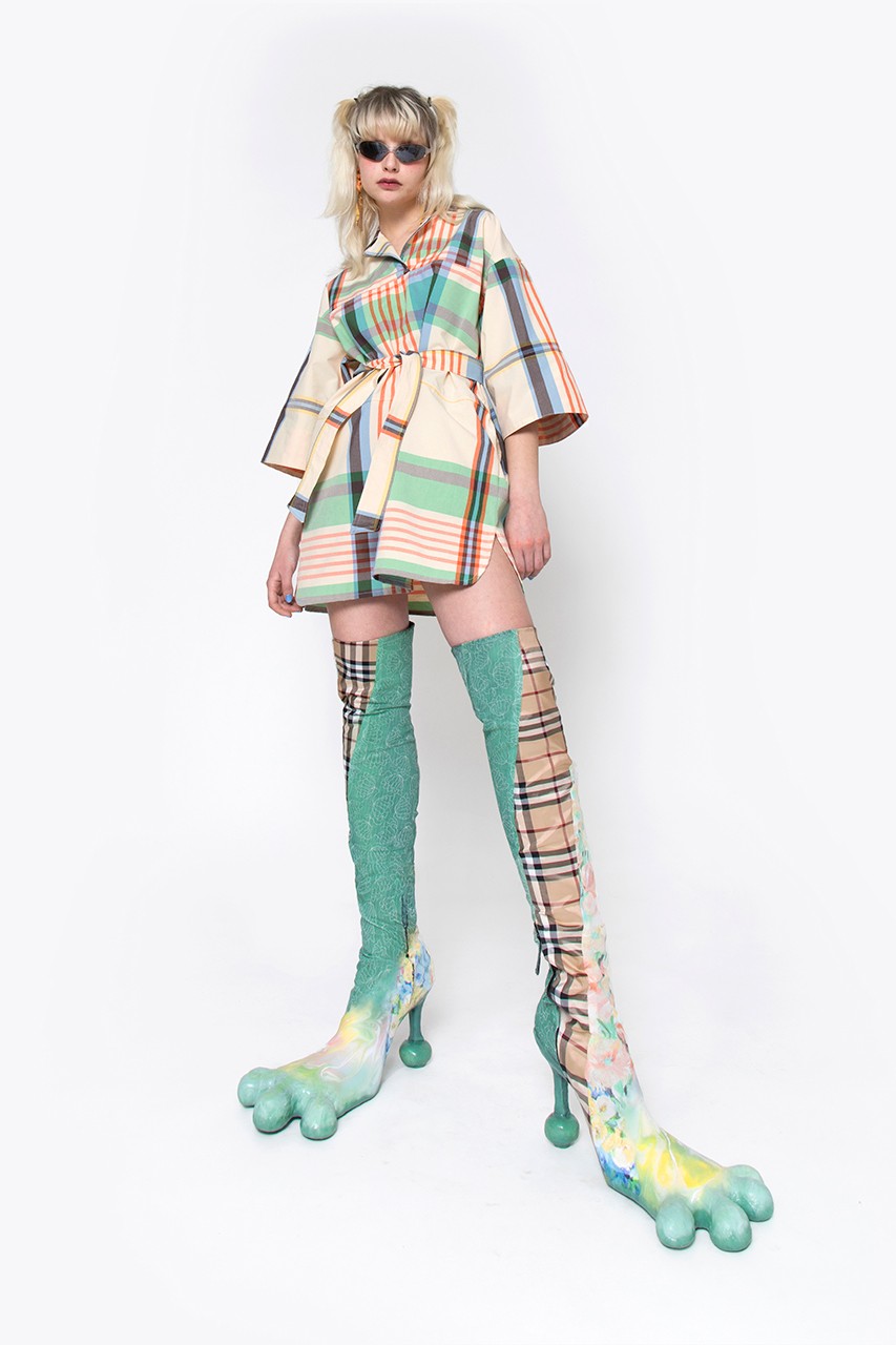 Gli inconfondibili tessuti di scarto delle maison abbelliscono non soltanto i capi di abbigliamento della nuova linea, ma anche le mostruose calzature. Oggetti di punta sono infatti il cappotto in spugna color arancio alternato da intarsi da una logomania di doppie FF e i mastodontici stivali con tipici motivi floreali di Jaqcuemus alternati alla nota fantasia tartan di Burberry. Abiti lunghi aderenti, completi pitonati, stampe dalle tonalità pastello, completano infine una collezione versatile, giovanile, dal retrogusto anni ’90.