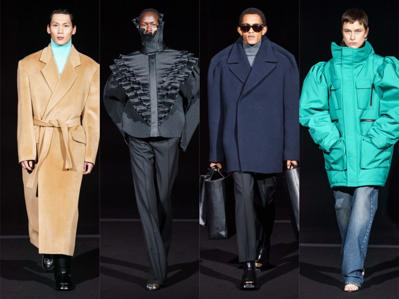 Il suo riadattamento delle silhouette monastiche di Cristóbal Balenciaga come colli alti e cappucci e la totale assenza delle sneakers va a favore di scarpe in pelle nera con punta quadrata e nuovi stivali alti da uomo. Assistiamo dunque a un’estensione estrema, intellettualmente spiritosa della reputazione di Gvasalia.