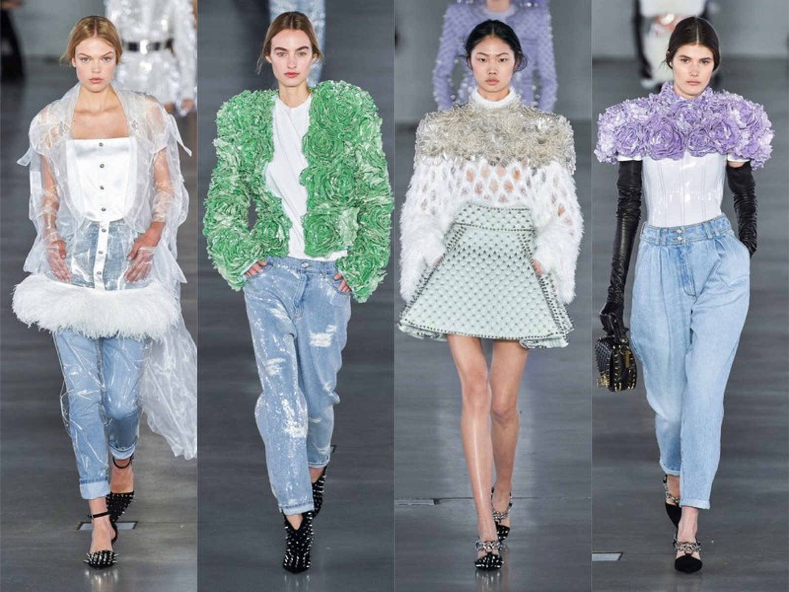 Le modelle, tra impalcature metalliche e lavorazioni interne dipinte con colori primari, hanno sfilato in passerella con stivali piatti e stringate da uomo, in un mosaico di trame, stampe e abbellimenti in stile punk-metal. Capi come la giacca trapuntata a fiori e il gilet oversize, si sono qualificati come gli elementi più sorprendenti dello spettacolo. L’eclettismo e l’audacia è stata la virtù ddell’intera collezione.