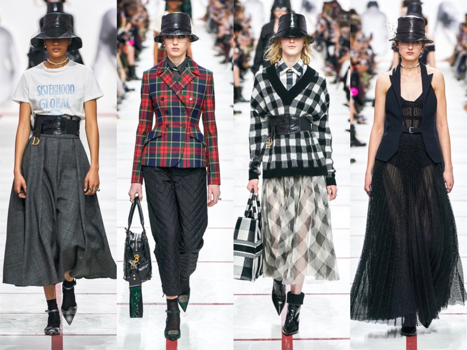 Maria Grazia Chiuri ha fatto riferimento agli archivi scavando attraverso pezzi degli anni ’50 e ’60, e si è imbattuta nella giacca di pelle nera di Yves Saint Laurent, che Chiuri ha rivisitato per la collezione FW19. Le modelle sfoggiavano cappelli a secchiello in un’ampia gamma di materiali, ispirati alla Teddy Girls e al rock’n’roll inglese del dopoguerra. Durante la presentazione, abbiamo anche visto nuove iterazioni dell’iconica Saddle Bag di John Galliano, così come la nuova Book Tote di Dior, che sottolinea l’occhio della designer per gli accessori.