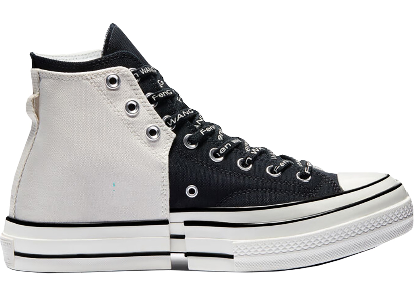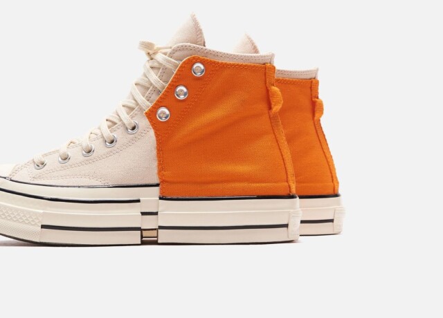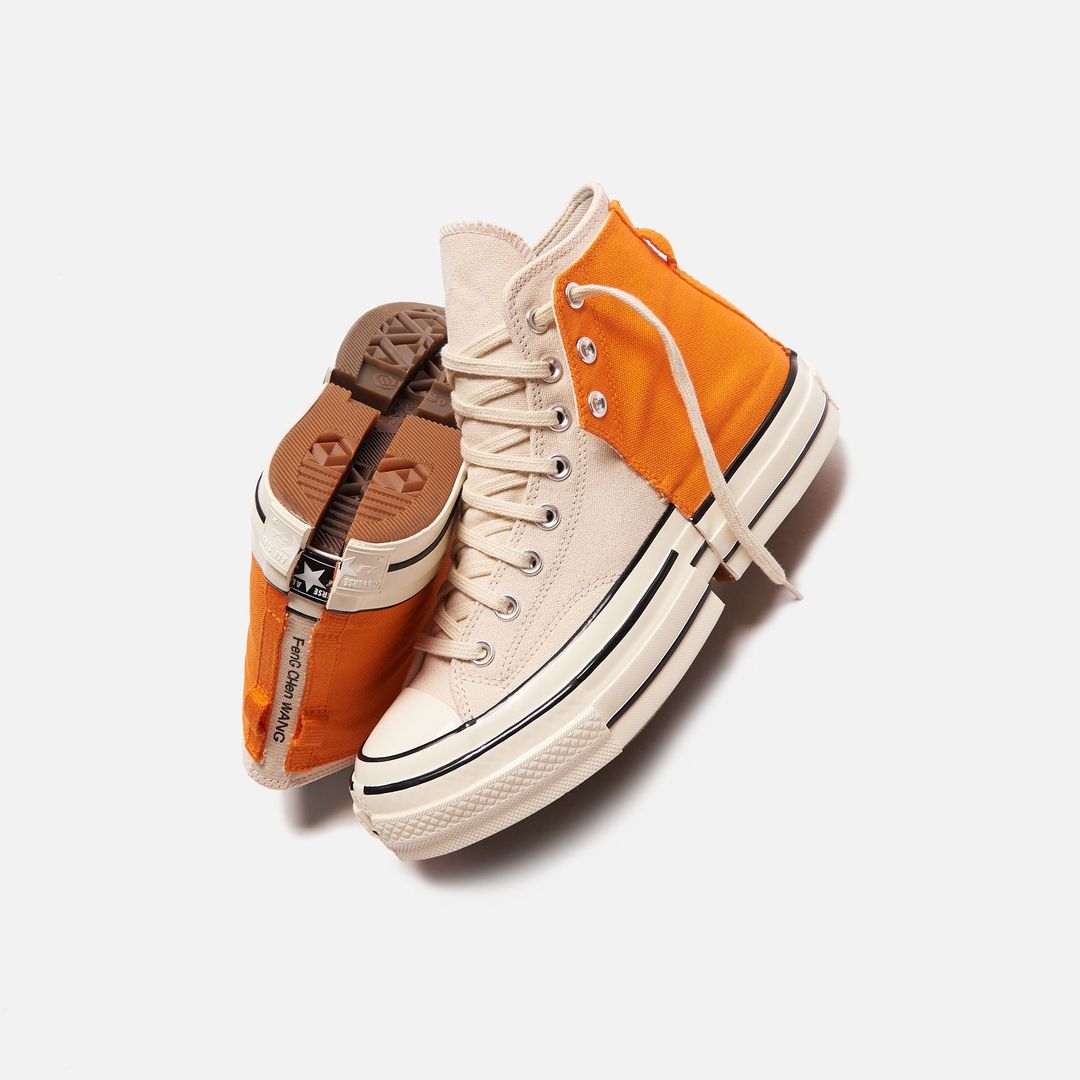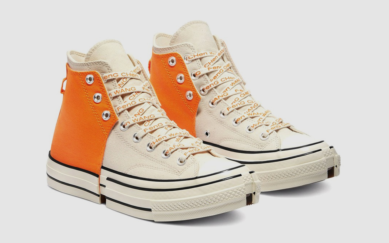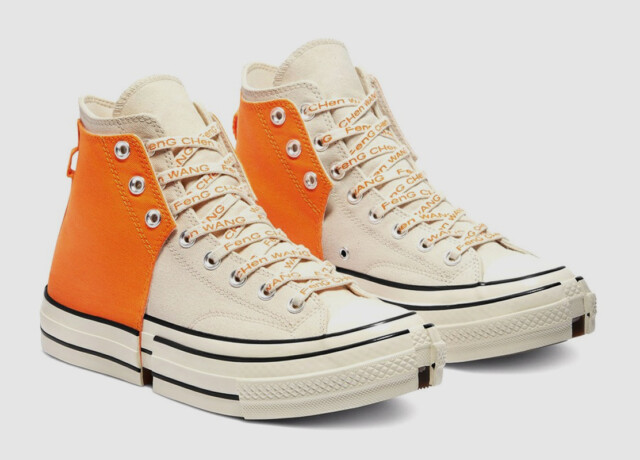 Le Chuck 2-in-1 di Feng Chen Wang si presentano in due combinazioni di colori, una nera e bianca e l’altra arancione e bianca, che prendono ispirazione dalla collezione “My Half“: proponendo due distinte metà di sneakers fuse l’una con l’altra, la designer ci ricorda come le parti uniche della nostra identità si uniscono per completarsi a vicenda.