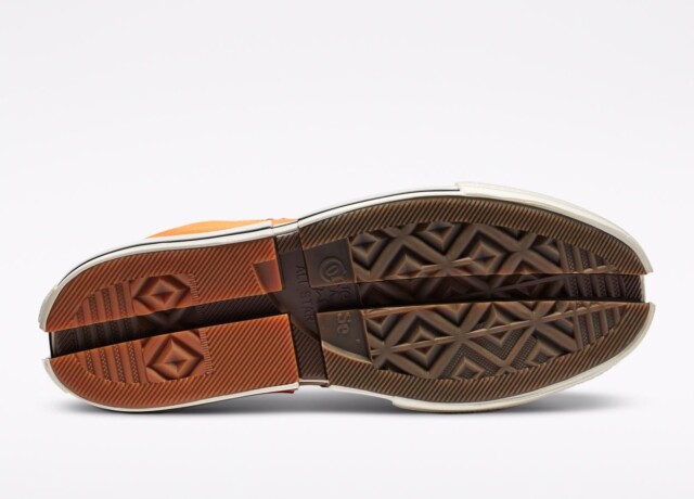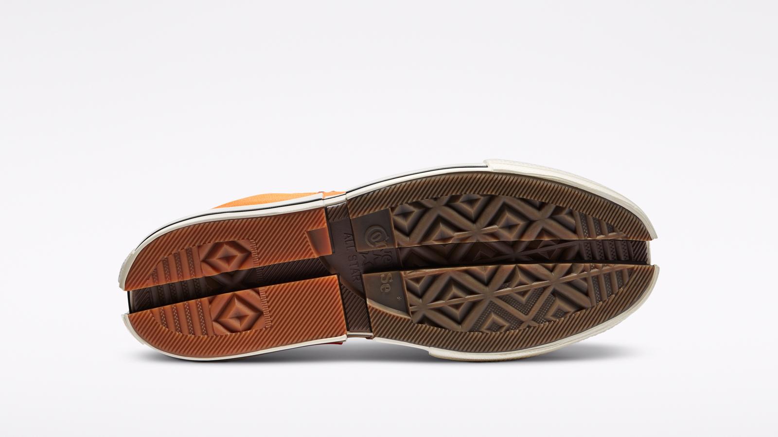 Questa reinterpretazione, rompe il design iconico delle Chuck e lo riassembla in una costruzione in tela organica con rivestimento in tela bicolore, una suola esagerata divisa in quadranti con doppio foxing unico, una soletta OrthoLite ed i loghi di entrambi i brand, presenti sul back e sui lacci.
