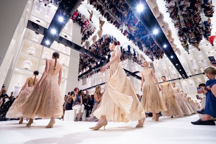 E così sotto un soffitto a specchio esteso per tutta la lunghezza della stanza, che al contrario è diventato virale sui social media, ha sfilato una collezione composta inizialmente da una struttura classica di haute couture, concludendosi infine con novità e fluidità.