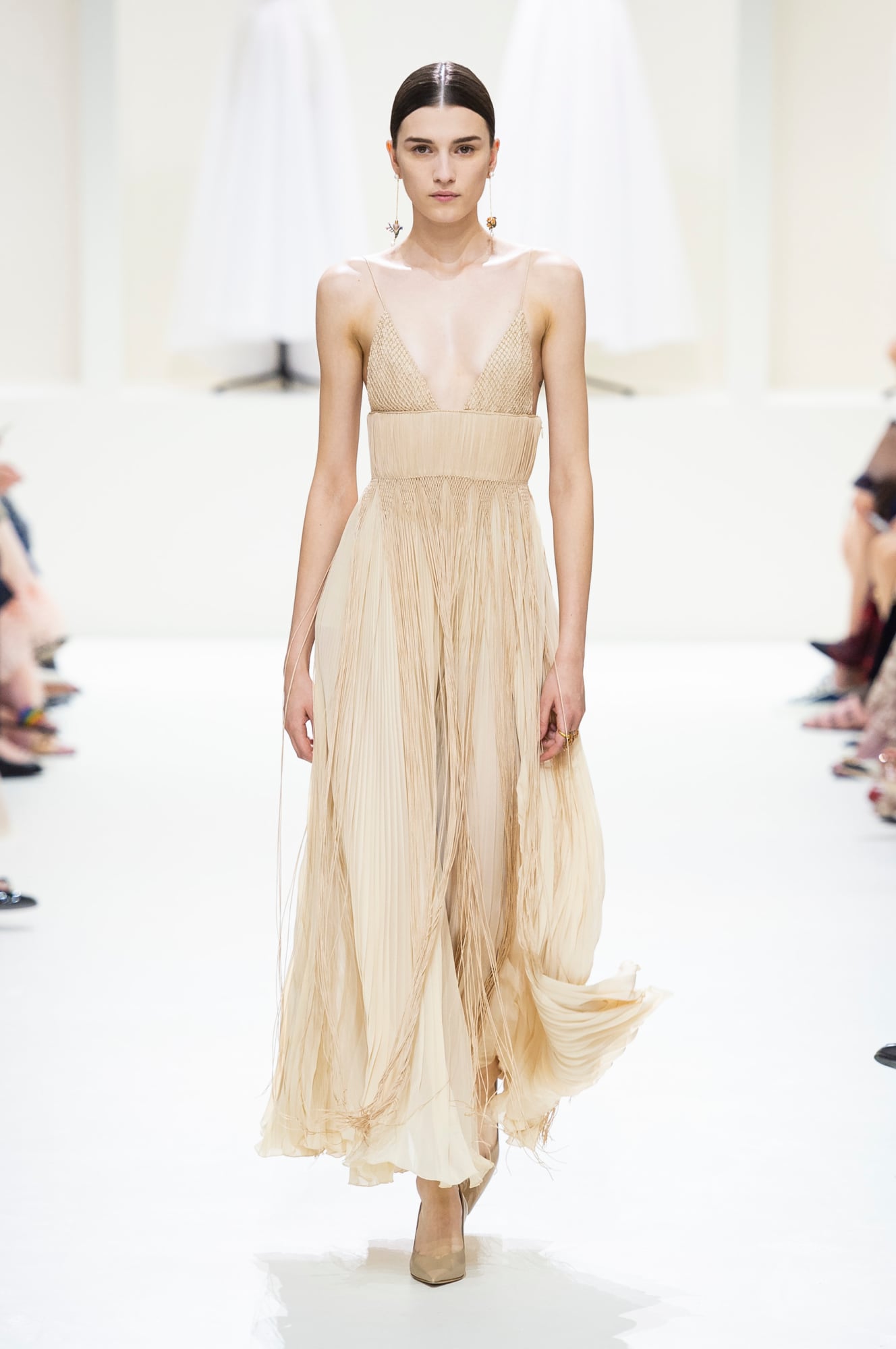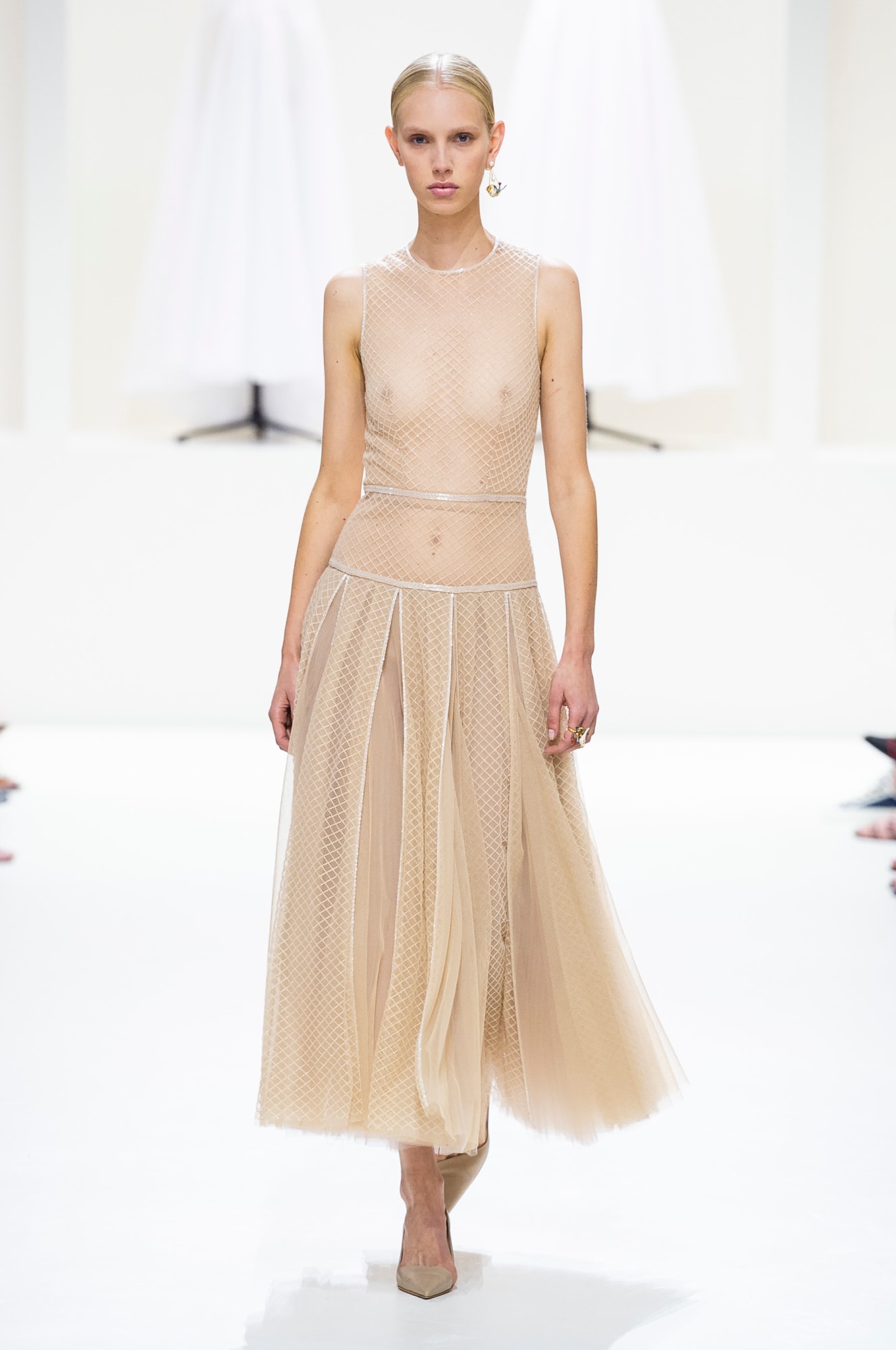 Lo stile più classico invece accompagna le scarpe a punta con il tacco ‘Virgola’ d’oro, e gli abiti da ballo in tulle o in pizzo leggiadro in tutte le tonalità del ‘nude’, il colore della pelle che ogni cliente dell’alta moda Dior può richiedere in atelier. E indossare un abito del colore della propria pelle è davvero il lusso supremo.