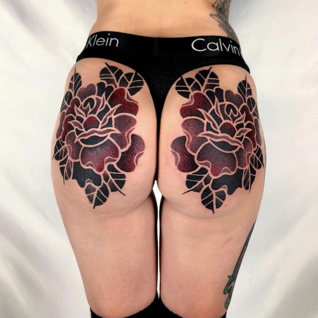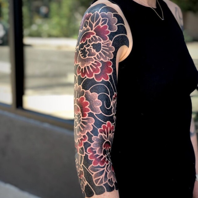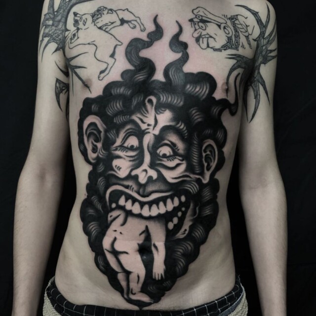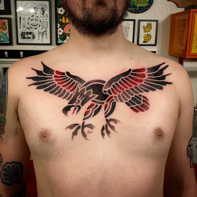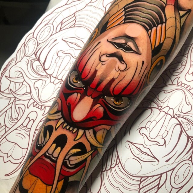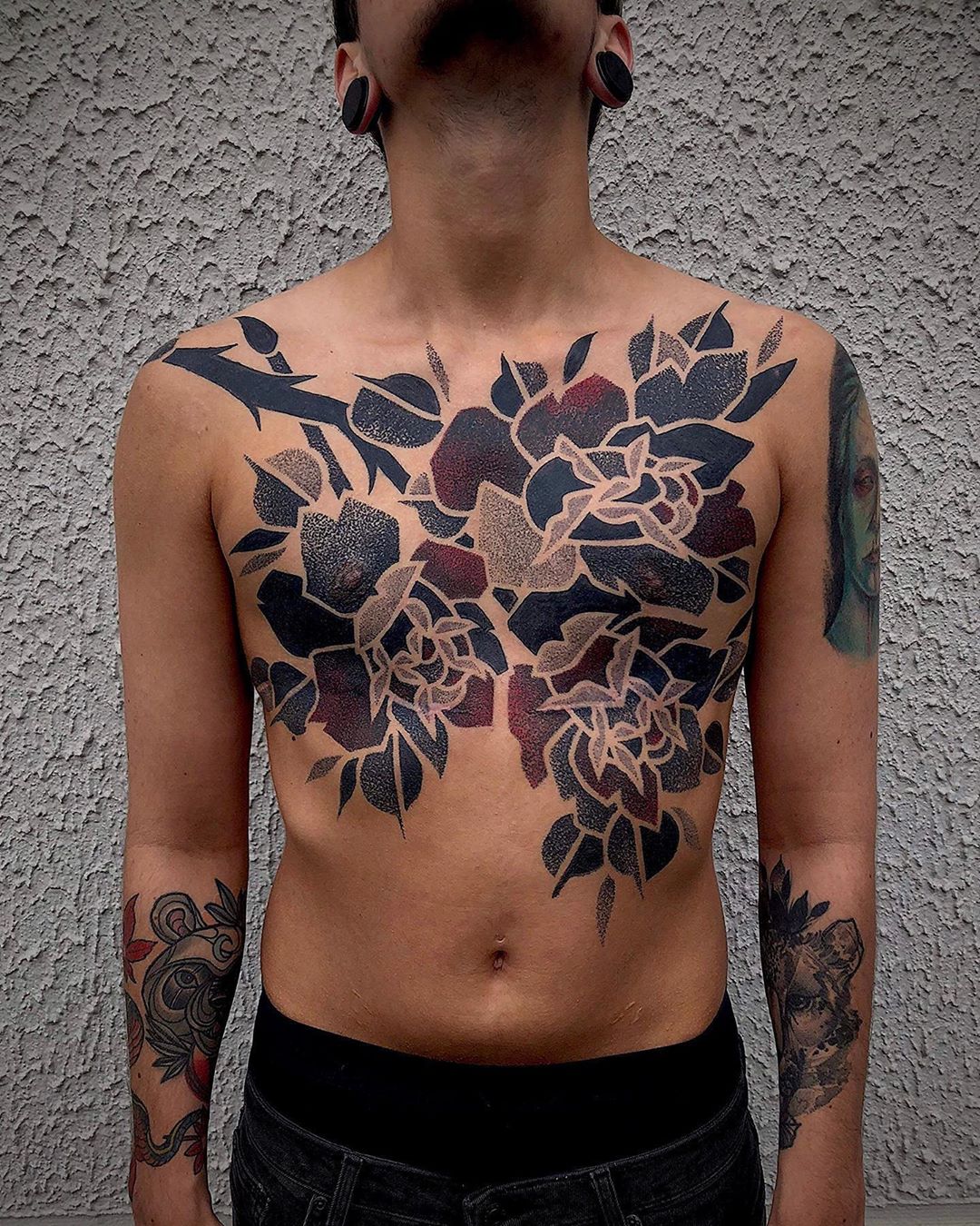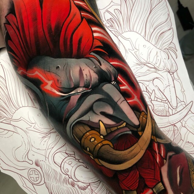 His tattoos are mainly in red and black, the colors used since the first, traditional tattoos.