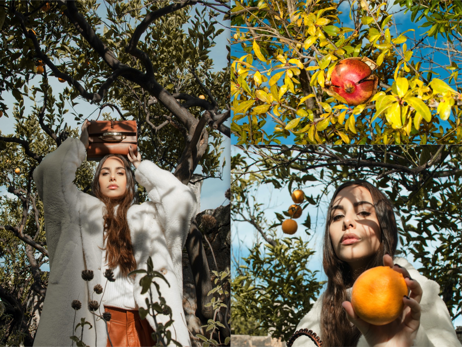 The fascinating trees typical of this land are the backdrop to the looks proposed by Russo Capri which, in this scenario gain prominence thanks to the stark contrast and obvious antithesis between local traditions and customs and contemporary garments.