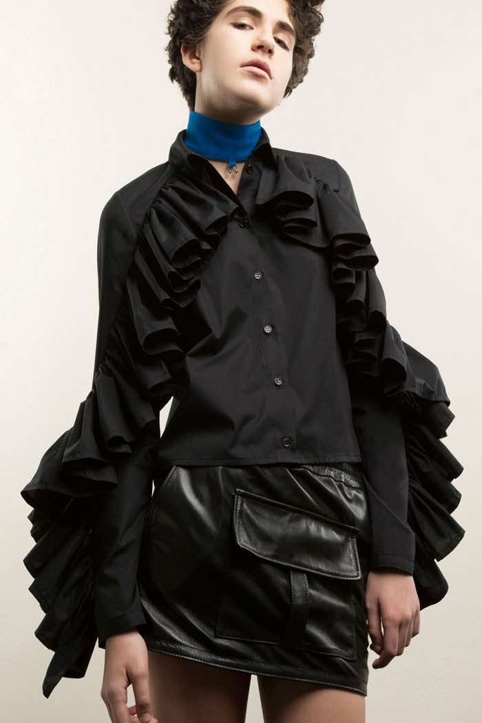 We try to insert this kind of dialogue or we can also say “contrast” in each piece. For example we can mix masculine codes with more feminine fabrics, or feminine shapes with some masculine details or even needs, like big cargo pockets, for example. It can be a classic shirt, like the one your boyfriend has in his wardrobe, then add something girly to it, it could be ruffles or open shoulders.