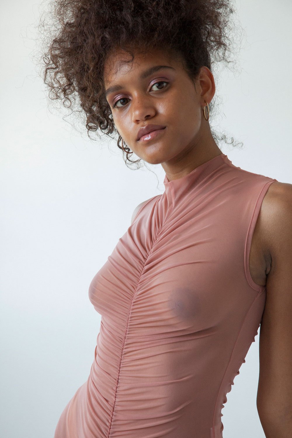 The draped model in antique pink with high neck is romantic and delicate: perfect for dreamers.