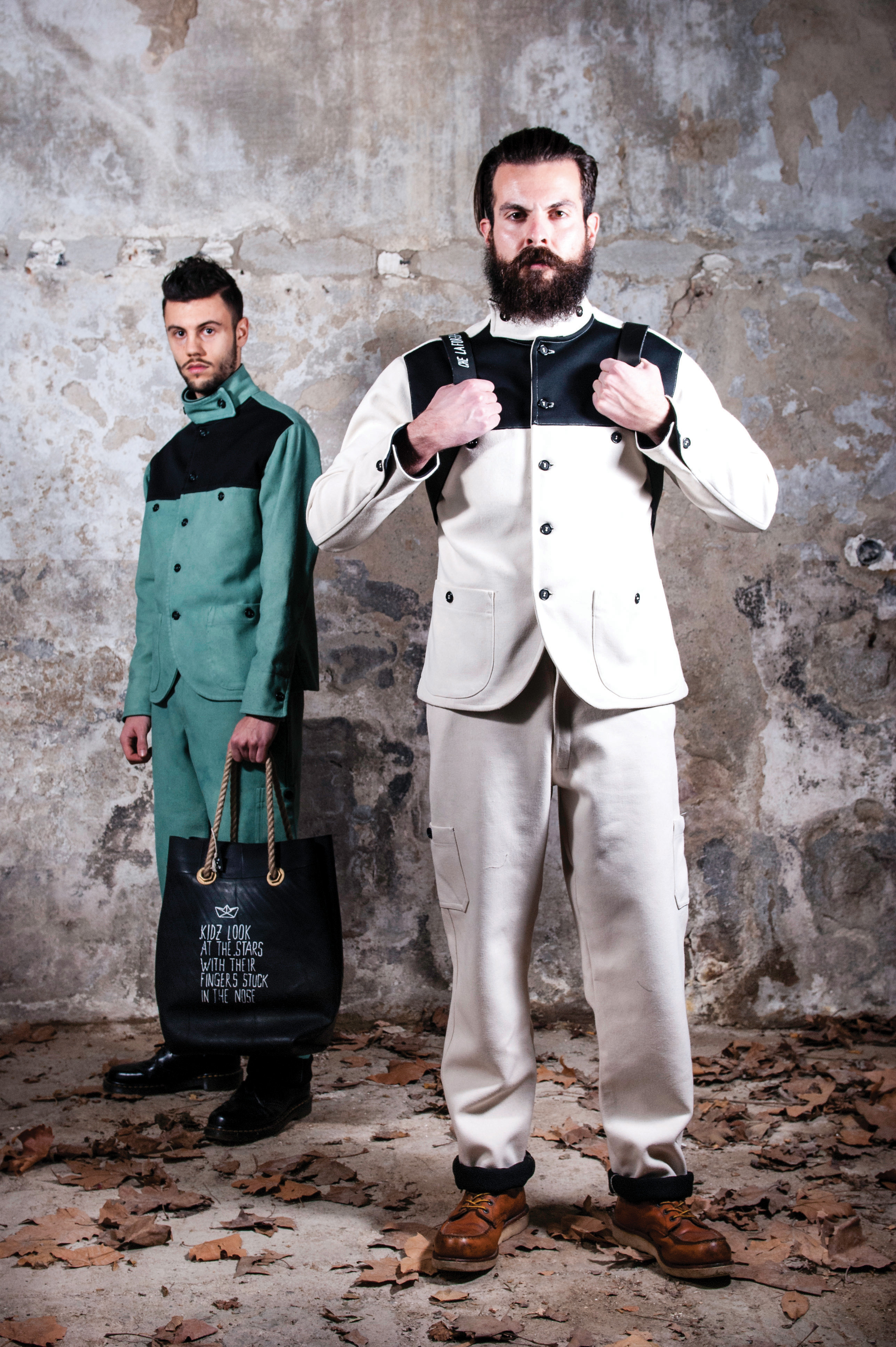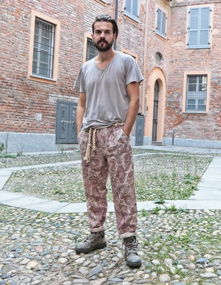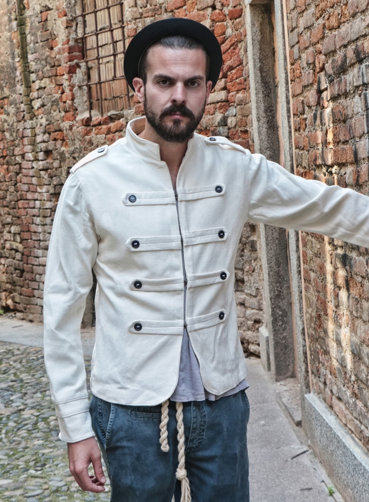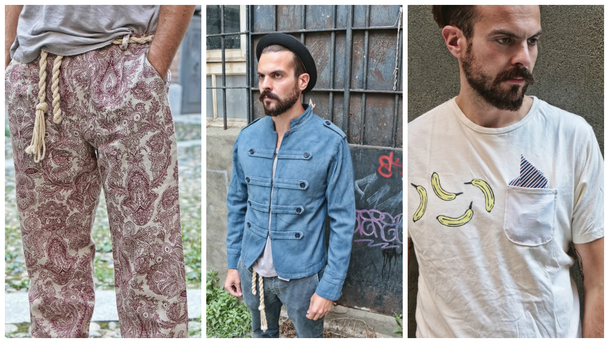 Before I talked about how I develop my collections. I talked about stories. Well, at the origin of every story there is a path mother made many “episodes” as there are collections. What will come out in March in the shops it called The soul is Growing. It ‘a collection where I face with a good awareness num- vintage style we mentioned above; the soul is growing is the daughter of my first winter output that is definitely a collection of research but much more calm … that’s why the visual impact at the level of chromatic pe is further accentuated. It ‘a very colorful collection that presents a part of the product accessible to a broader target customer, represented by t-shirts, polo shirts, long t shirt, shirts … all rigorously treated with natural enzymes to aid an effect and old school embellished with hand embroidery, repeating patterns in screen printing of bananas, flamingos, anchors etc … the other part of the collection, say that of the total look is much more concept: developed on two fabrics: cotton and linen. Talk about garments coming here and there from different contexts so that the pants in linen damask draws east, the admiral jacket with hooks central recalls the Beatles and dungarees vertical stripes seems that of a American painter intent to brush the fence. Bestseller definitely jacket “Beatles”, ordered by almost all the shops I have. what, in hindsight missing in this collection, it is the development of a part of the product processed with washing a little ‘more basic and less pop say, so people will buy always the same three colors …