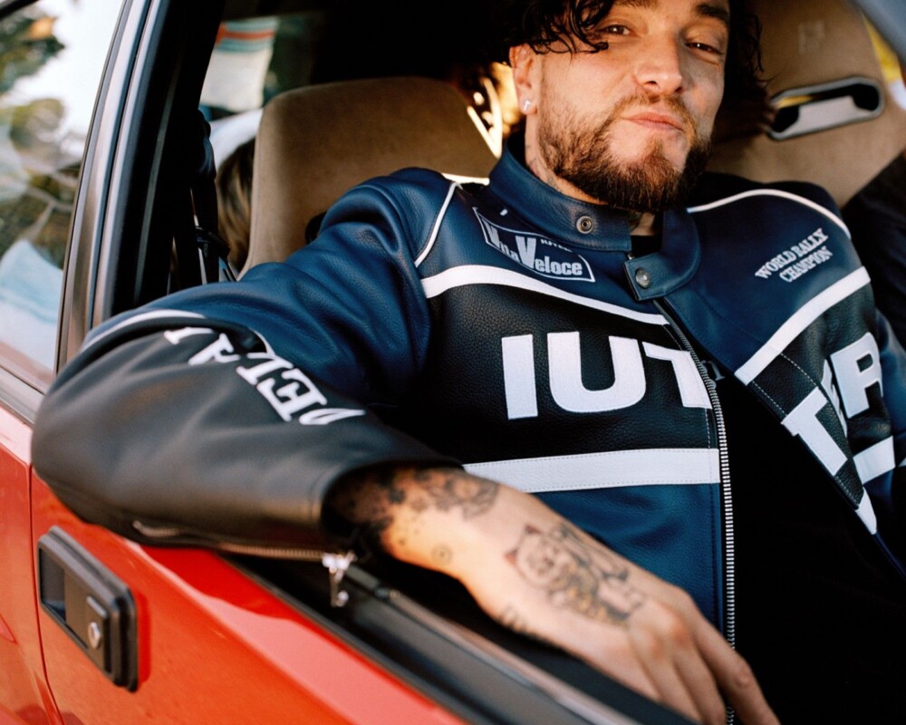The black and navy blue leather jacket with white contrasting bands features a cut and details that refer to the world of rally drivers, the maxi embroidered “Iuter” logo stands out in the center of the chest and is surrounded by various patches.