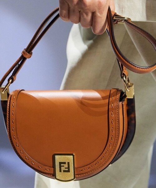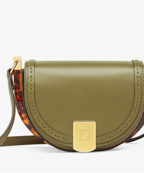 The clean and compact line is reminiscent of a crescent and is characterized by a metal closure and golden Fendi Roma’s logo hot stamped under the flap. The bag, which is available in seven colors, is inspired by the moon and the sun, also equipped by a shoulder strap and metal accessories that make it practical and manageable. It also has a lined internal compartment, a small pocket and plexiglass details with tortoiseshell brown effect.