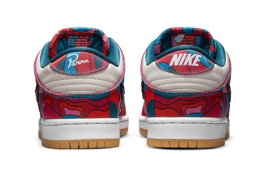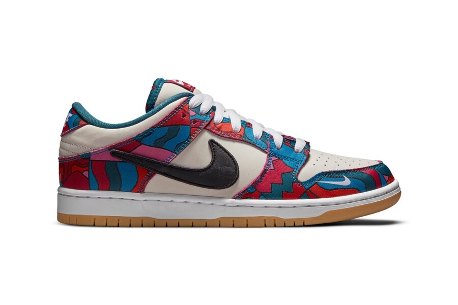 The first proposal concerns the Dunk Low model designed with Parra. The captivating colored graphics that dominate the white leather upper perfectly recalls the design of the uniforms. To complete the work of art are added details such as the black swoosh placed on the side and of course the Dutch artist’s signature positioned on the heel.