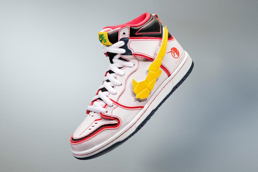 The second proposal refers to the Japanese toy culture and finds inspiration in the transformable robot: Unicorn Gundam. The result, in fact, of the collaboration between Nike and the well-known animated franchise Gundam, the Nike Dunk High is available in two different colors: “White / Amarillo” and “Thunder Blue / Metallic Gold”. Imagined as if it were a robotic toy, the sneaker features graphic details in relief such as the swoosh in interchangeable velcro.