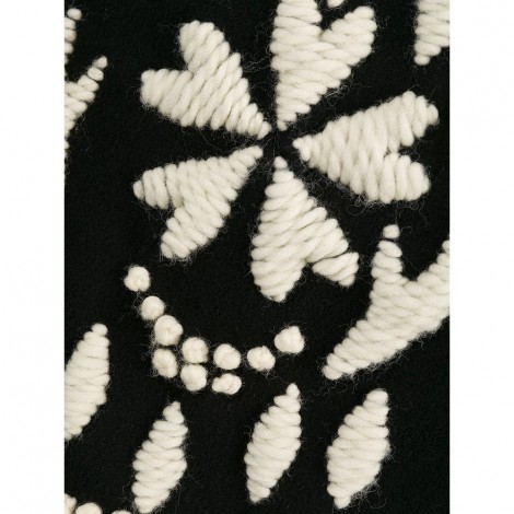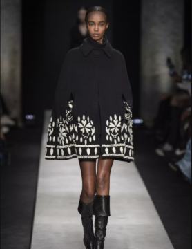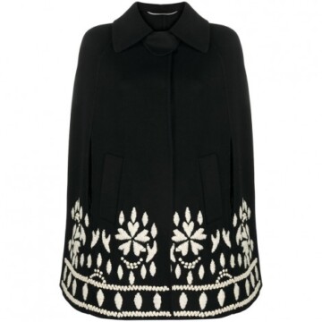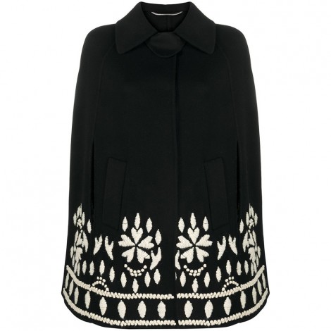 The one in black proposed by Ermanno Scervino is entirely embroidered in white thread with a floral pattern, has a shirt closure that lets the cape slide softly on the hips, giving a beautiful silhouette.