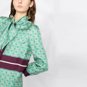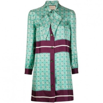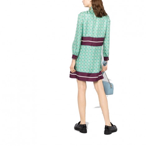 Today we have selected for you this lively short-cut silk bow-neck dress, by GUCCI, water green and burgundy colored, with bow on the neck, metal buttons and GG logo print interlocking.