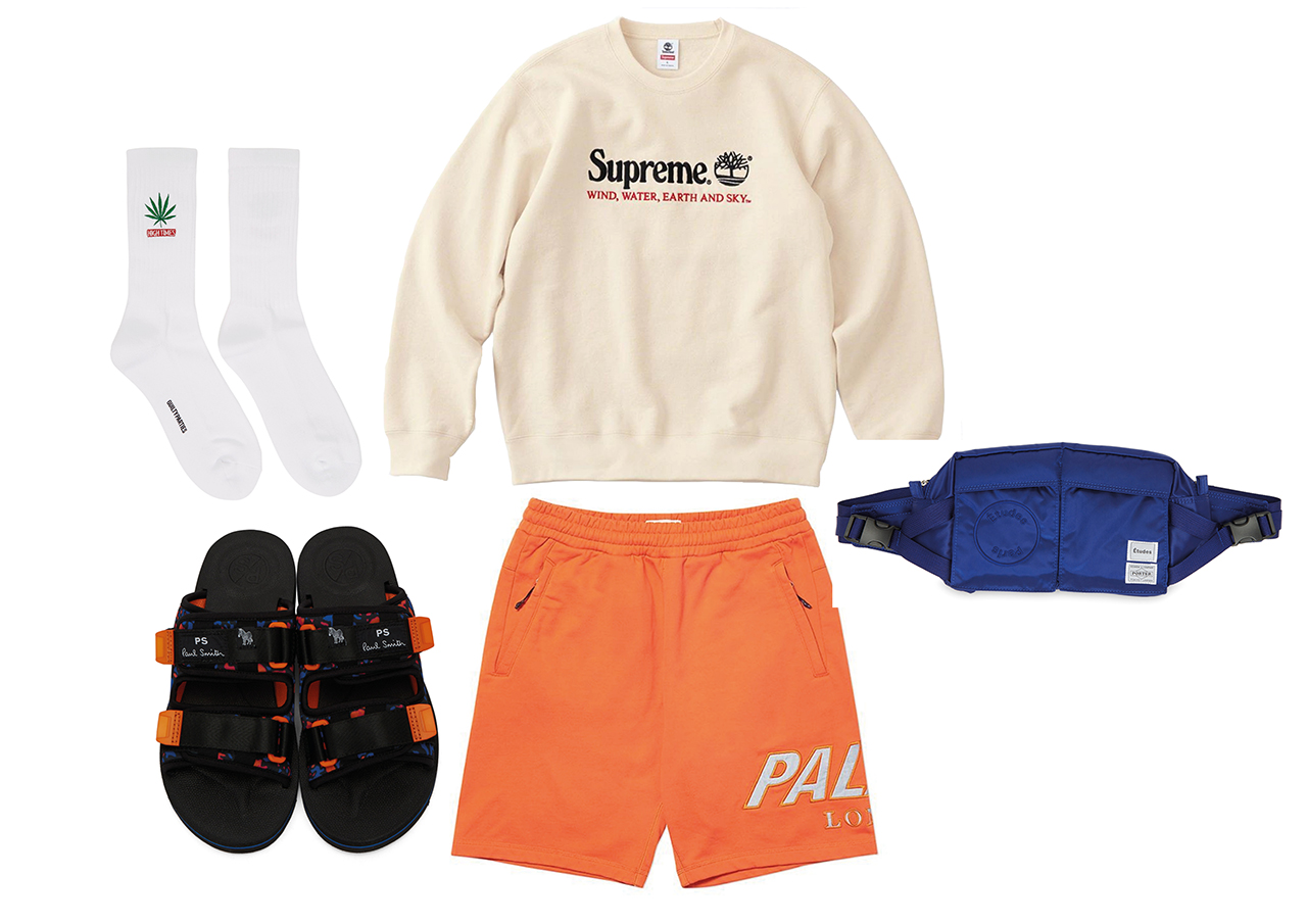 For the sunniest days when you will return free to wander in your city, we recommend the sweatshirt born from the collaboration @supremenewyork e @timberland combined with Palace orange shorts.