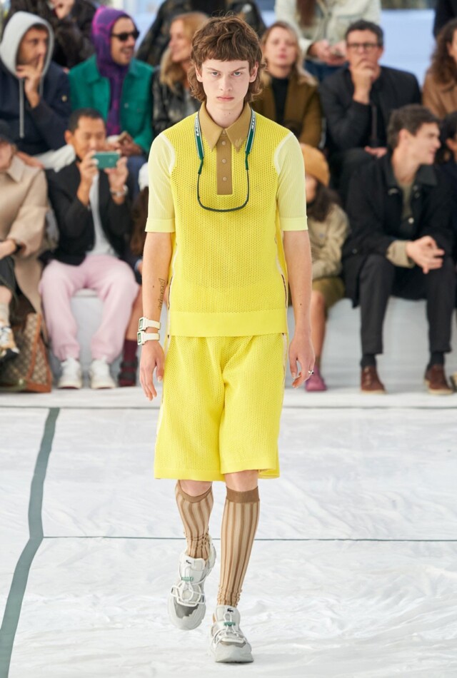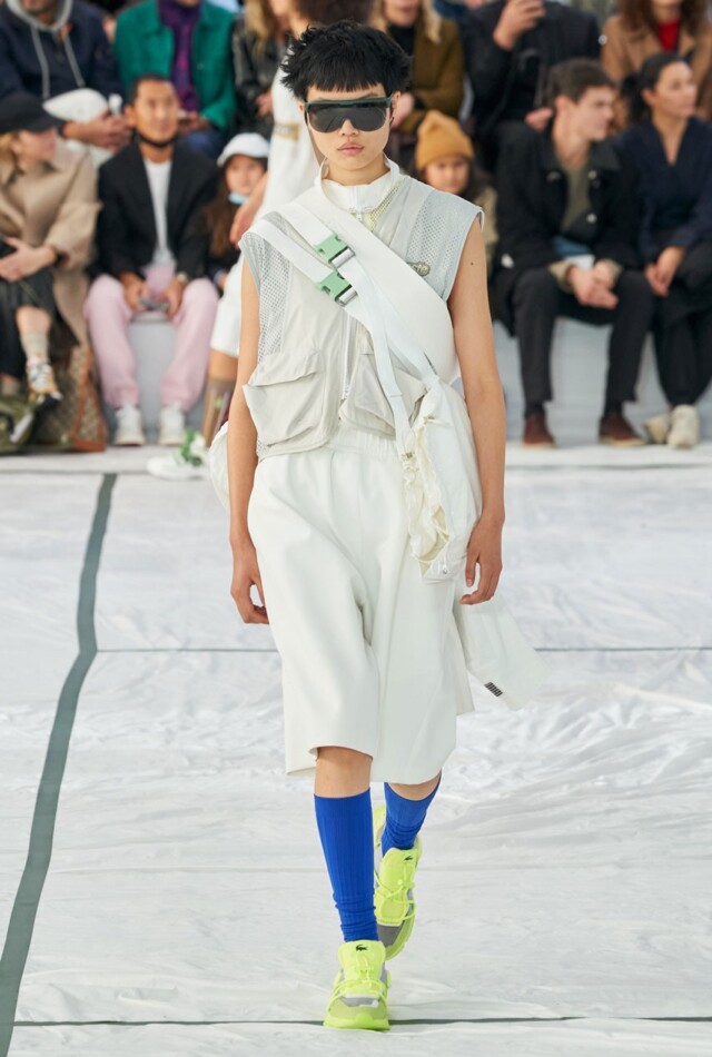 If we think of Lacoste we certainly think of the polo and therefore of tennis, here in fact the French brand has set up the catwalk as a field with nets, boundary lines of the field and referee positions.