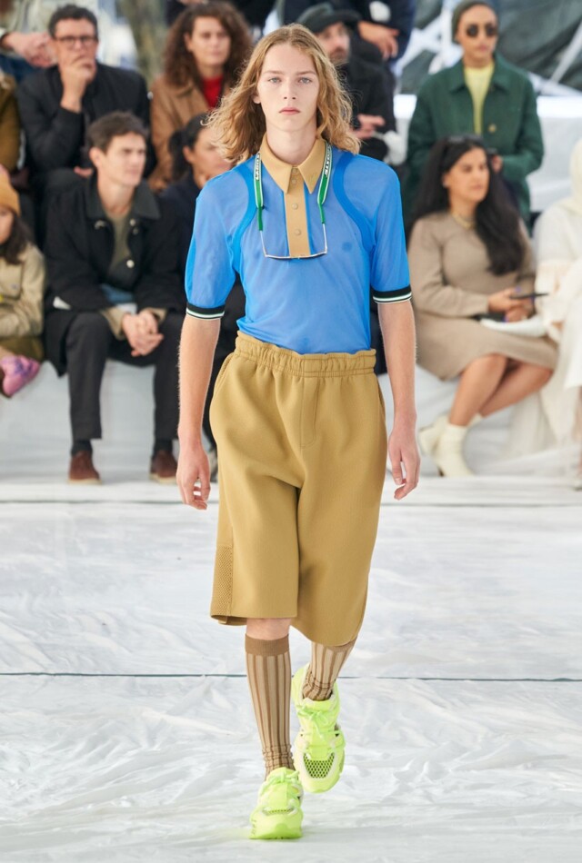 In addition to the classic polo shirt paired with sweaters and pleated skirts, the models wear oversized tank tops and shorts, waterproof jackets such as anorak of different lengths, knitted or lacquered shorts and more structured and elegant blazers.