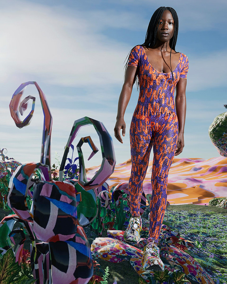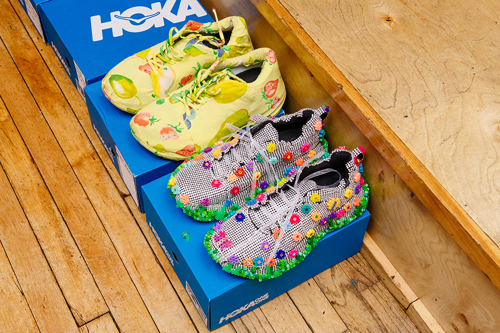 Lavoro con Hokas per usare le loro scarpe in passerella. Per questo motivo mi limito ad abbellire queste sneakers ed abbinarle ai look. Non sono in vendita e difficili da replicare, ma penso che funzionino bene con l’intero concept.