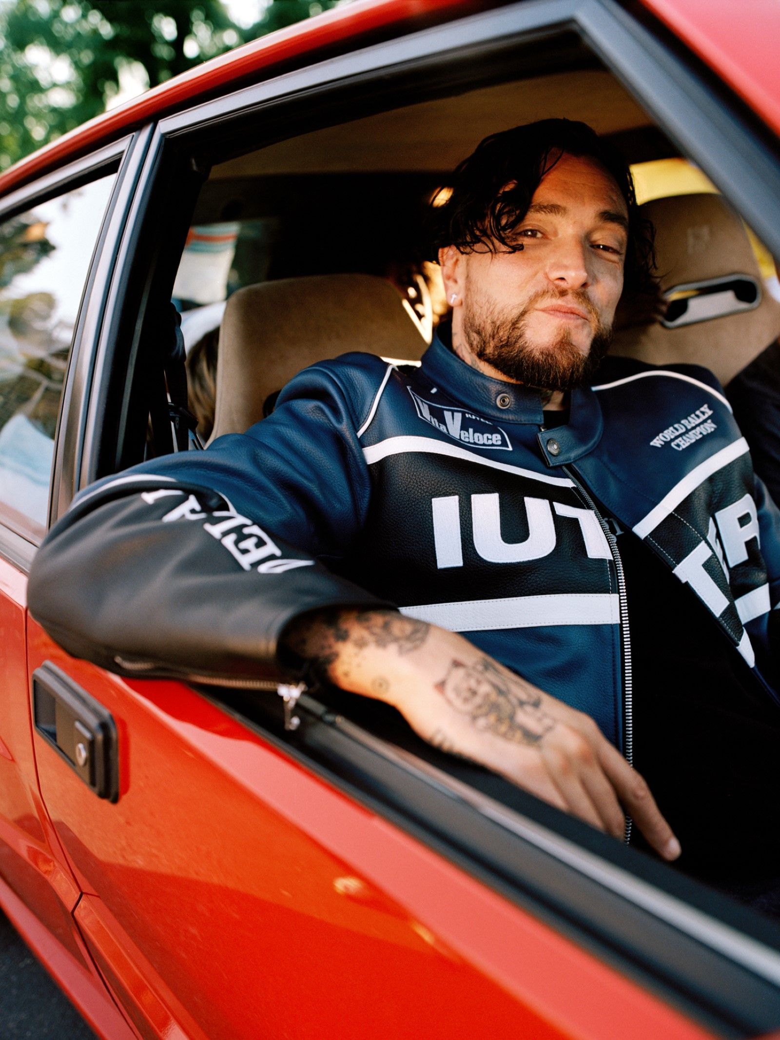La giacca in pelle nera e blue navy con bande a contrasto bianche presenta un taglio e dettagli che rimandano al mondo dei piloti di rally, il maxi logo “Iuter” ricamato risalta al centro del petto e viene contornato da diverse patches.