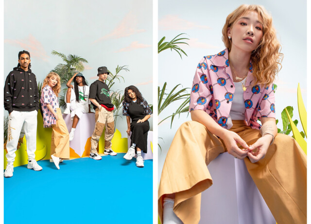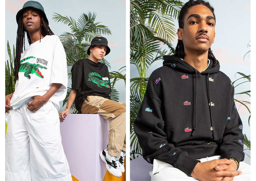 Il logo Lacoste, viene risaltato dai colori sgargianti caratteristici del famoso marchio di streetwear americano, in una color palette sulle tonalità del giallo, bianco, rosa e lilla. Un’altra stampa creata per l’occasione, raffigura il globo in una stampa allover, affiancato alle firme dei due brand.