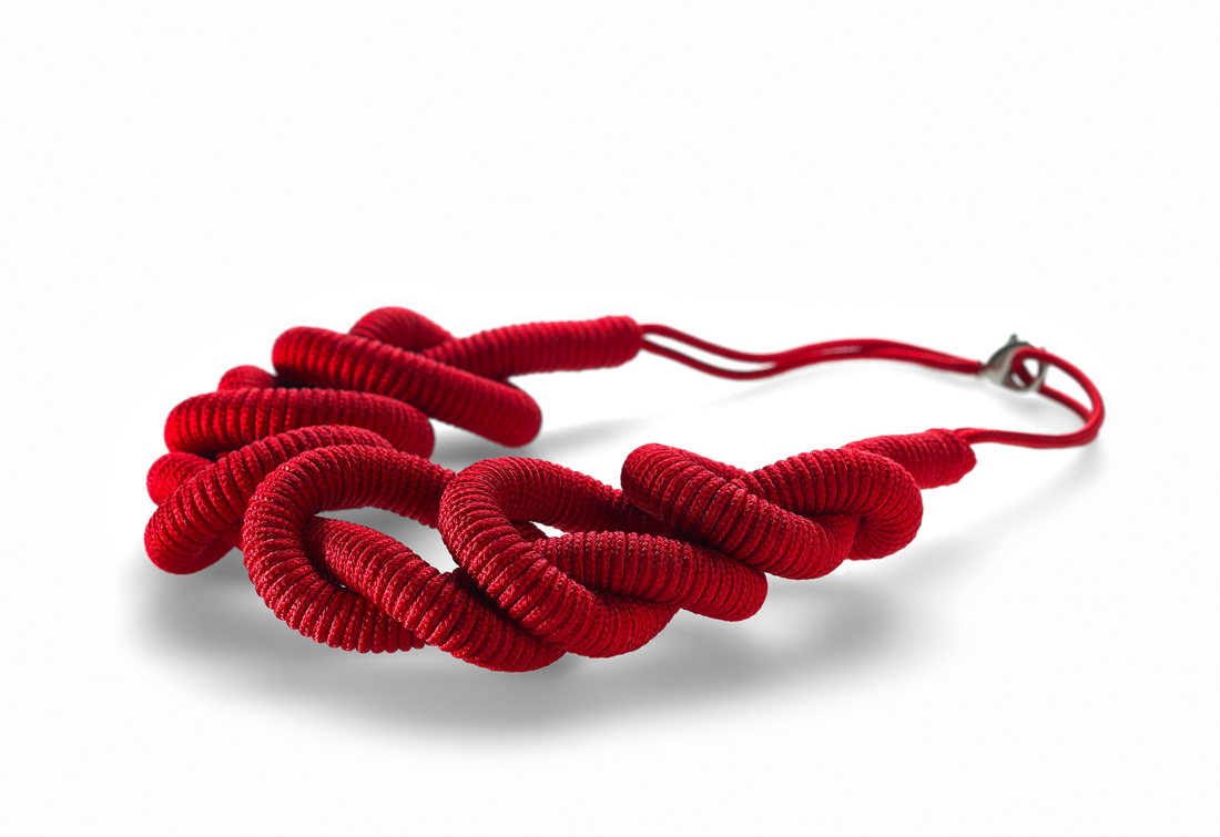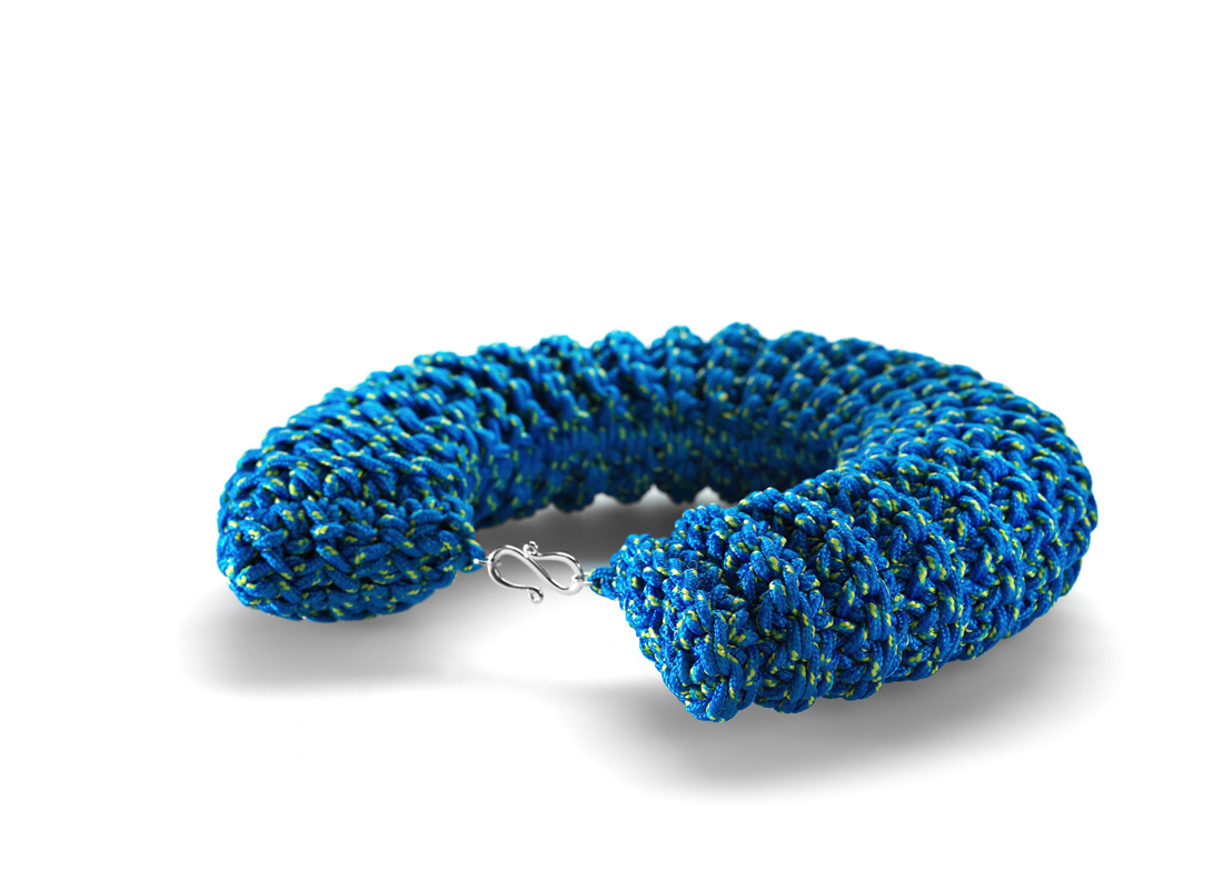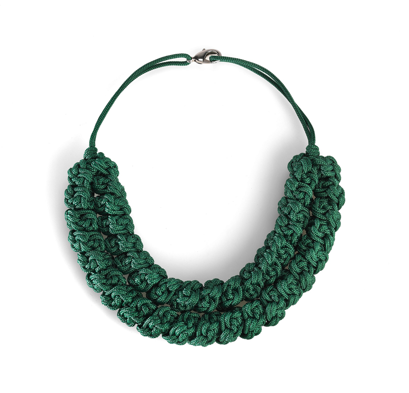 Vere e proprie sculture indossabili a carati zero.Pezzi unici ed handmade, i gioielli di Francesca Porro stupiscono l’osservatore con la loro « audacia della semplicità ». Ogni pezzo è il risultato del suo lavoro artigianale di nodi e crochet, nella persecuzione di una combinazione perfetta tra texture, forme e colori. La missione è quella di creare macrovolumi innovativi ma allo stesso tempo ergonomici, per attirare lo sguardo sul collo di chi indossa le collane Leek senza essere appariscenti a tutti i costi. La designer di gioielli rielabora le tecniche della tessitura tradizionale utilizzate nel restauro degli arazzi, traslandole in materiali più contemporanei ed inesplorati : le corde industriali in fibra sintetica. Ogni collana racconta una storia : il filo crea una trama nei grovigli, nei nodi e nei passaggi a crochet ; l’occhio si perde nelle nuance create dalle ombre degli intrecci. Comunicare con pochi elementi, essere audaci nella semplicità, distinguersi senza farsi notare sono i principi su cui si basa l’eco-design di Leek.