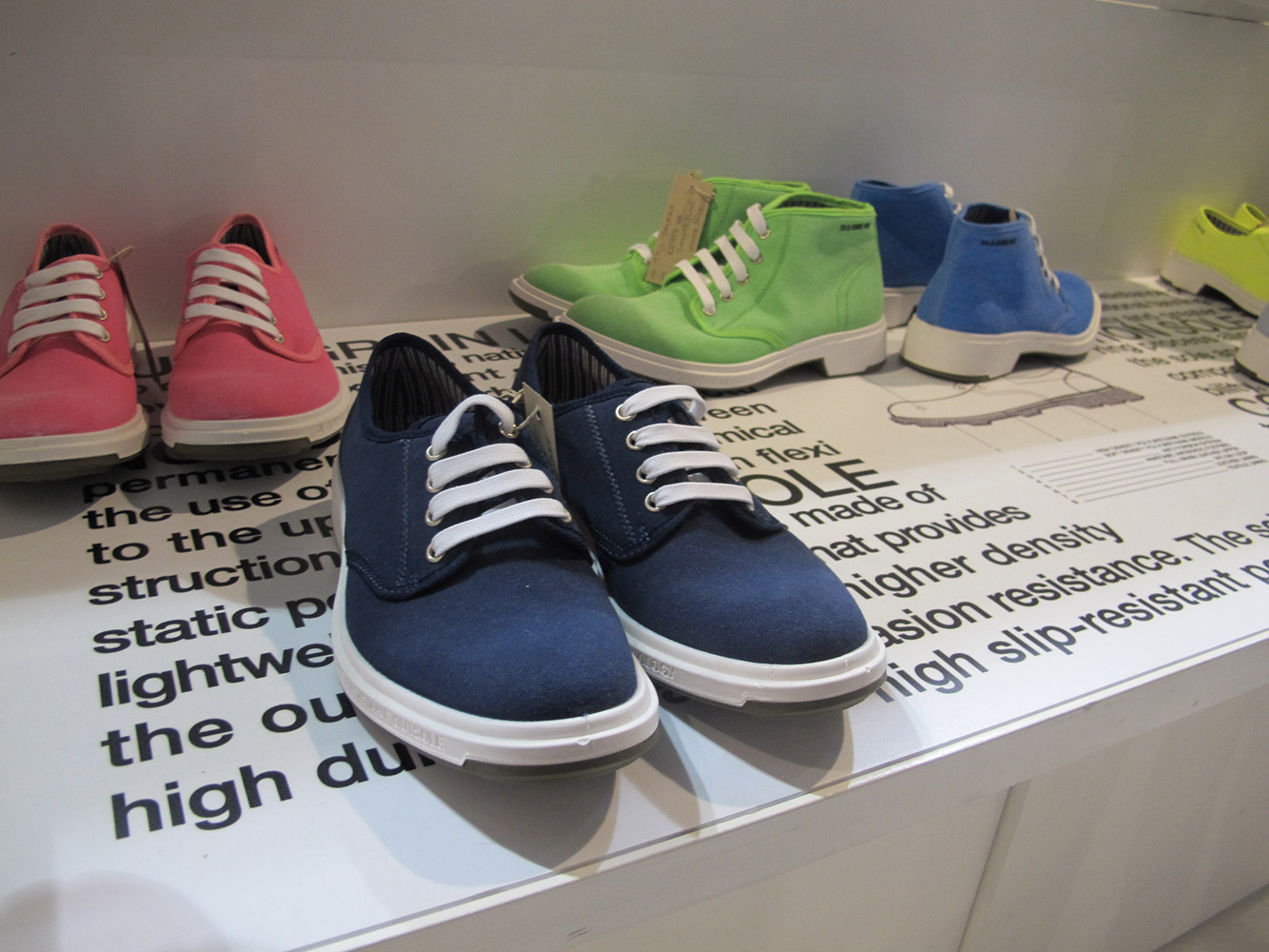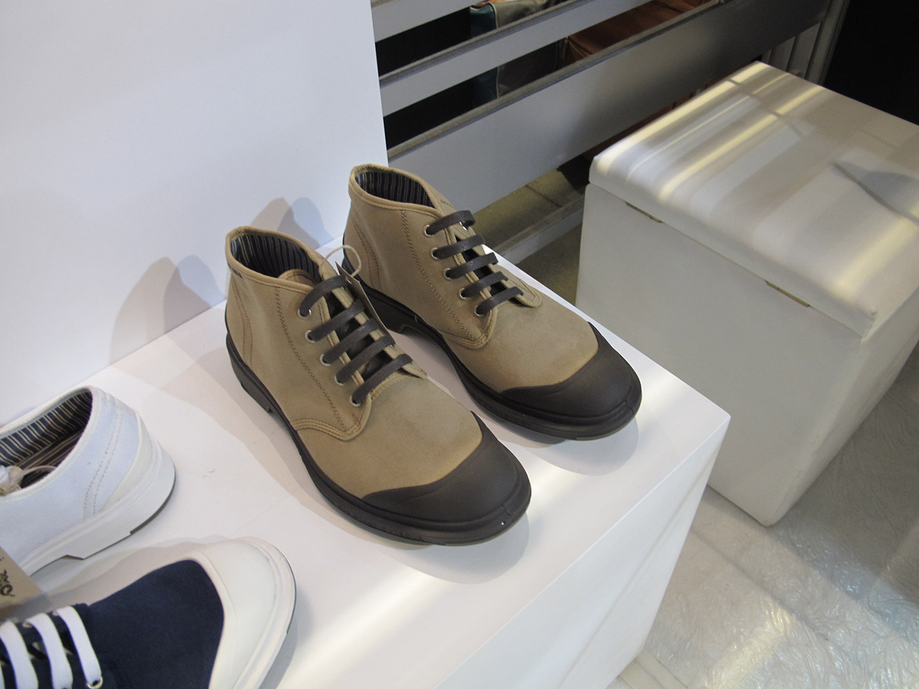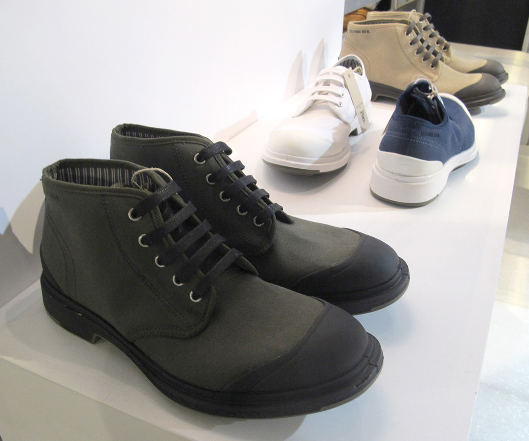 Al Super abbiamo apprezzato soprattutto i modelli low e high, con colori come l’oliva e il blu, con il dettaglio della gomma riportata sul puntale: un aspetto rude reso più prezioso dalle fodere rigate.