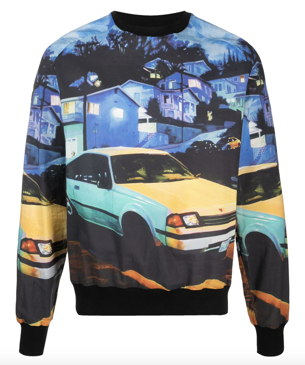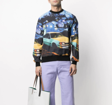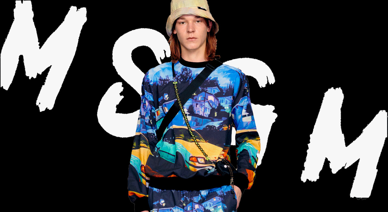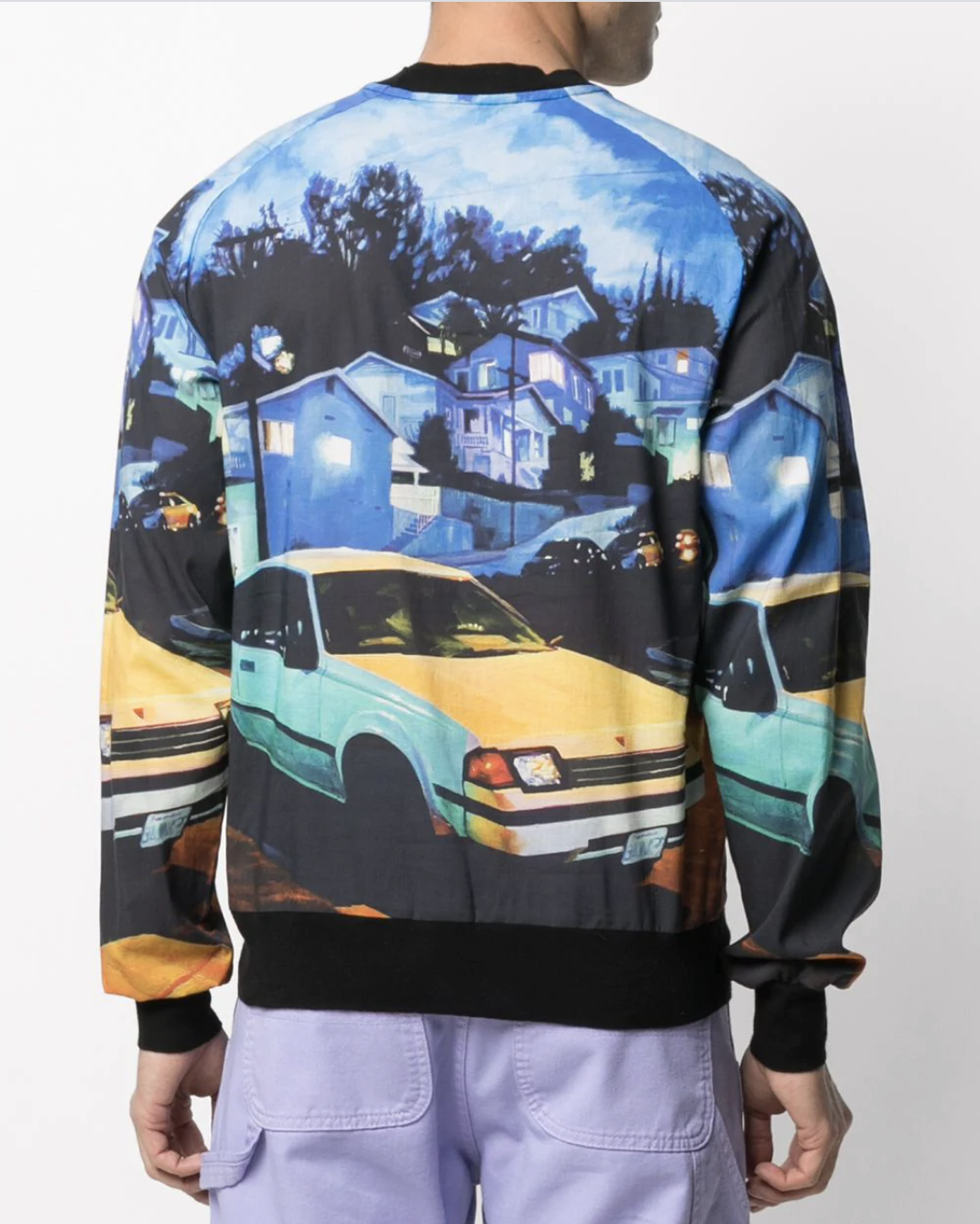 Presentata nella collezione ss21 di MSGM, questa felpa girocollo mette letteralmente in primo piano la strada con una stampa dove la palette di colori si manifesta progressivamente dai toni azzurri di un cielo al crepuscolo, per arrivare ad un giallo ocra della luce dei lampioni riflessa sulla macchina.