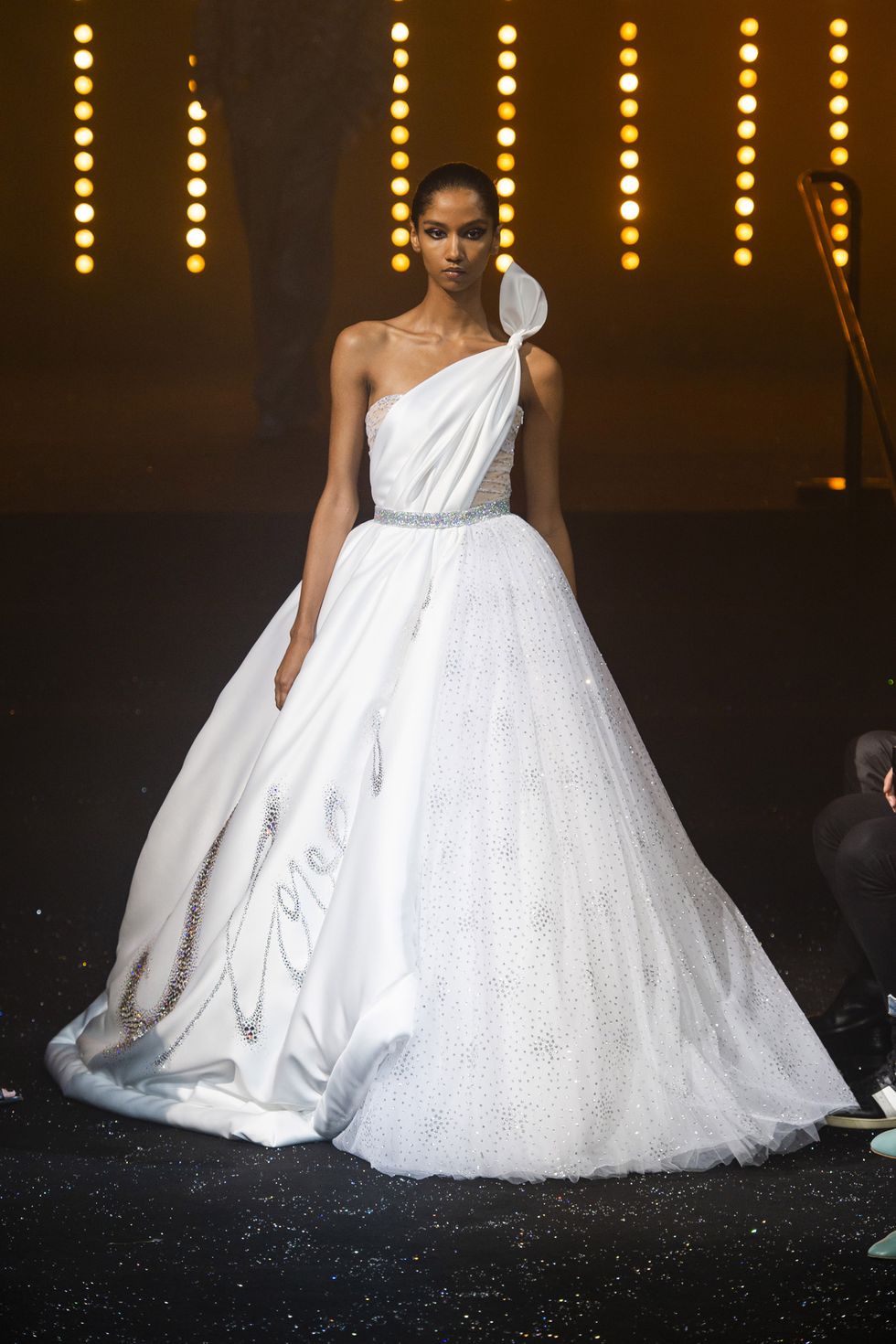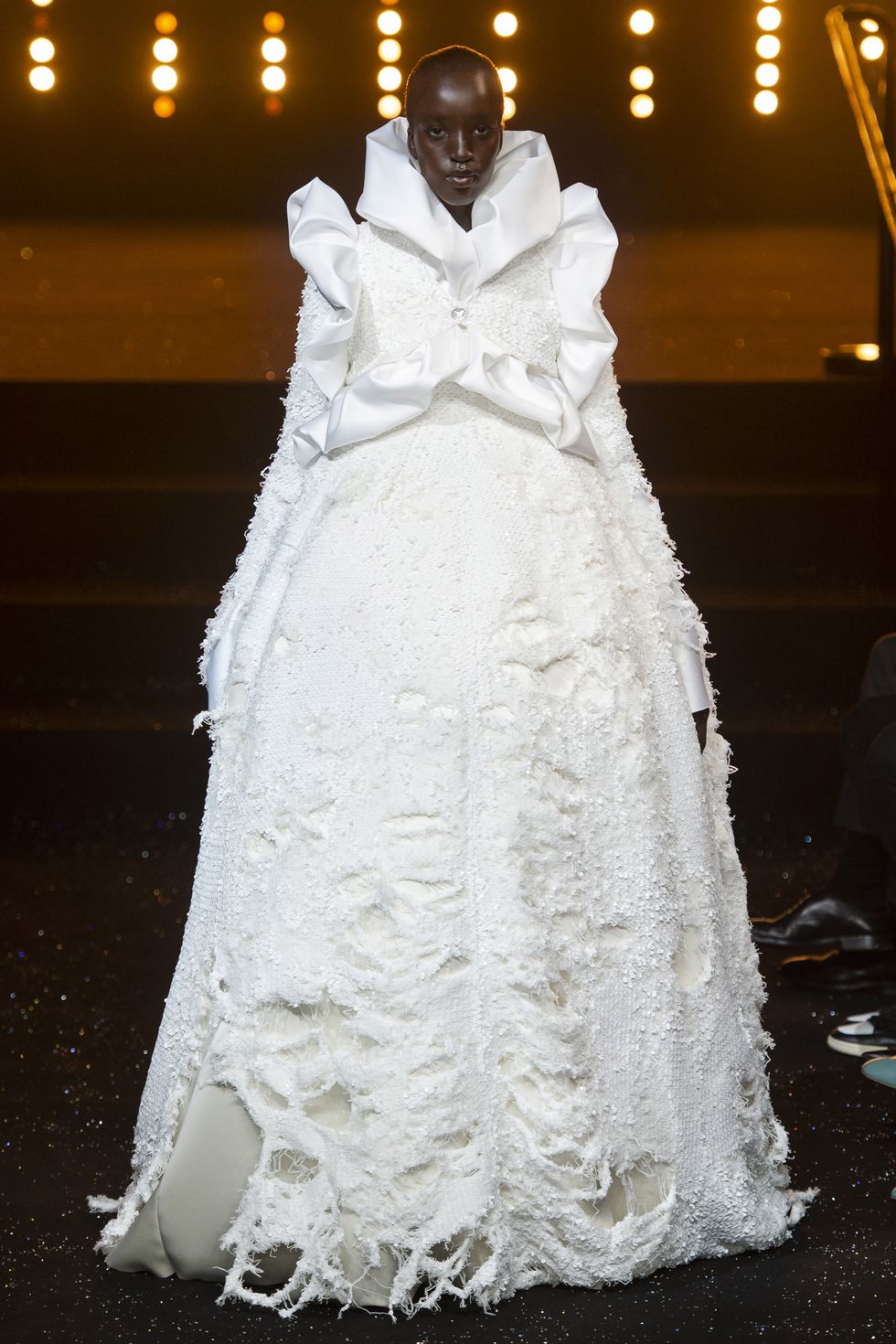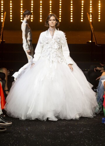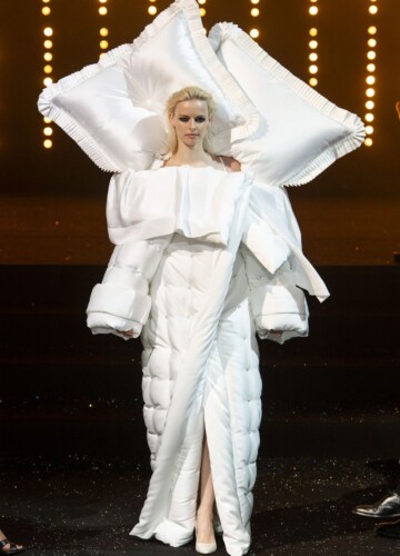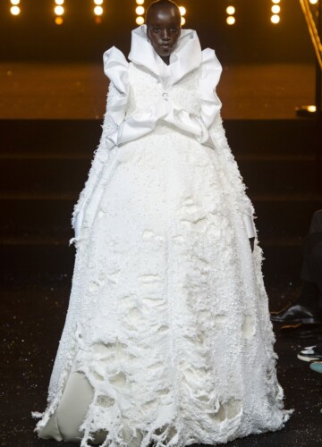Su questa scia, un voluminoso abito da ballo inguainato in uno strato di lana decadente, basato sul loro primo vestito, ha spiccato su tutti. (L’originale fu invece presentato al festival di Hyères nel 1993, vinto dal designer ed era in argento e grigio.)