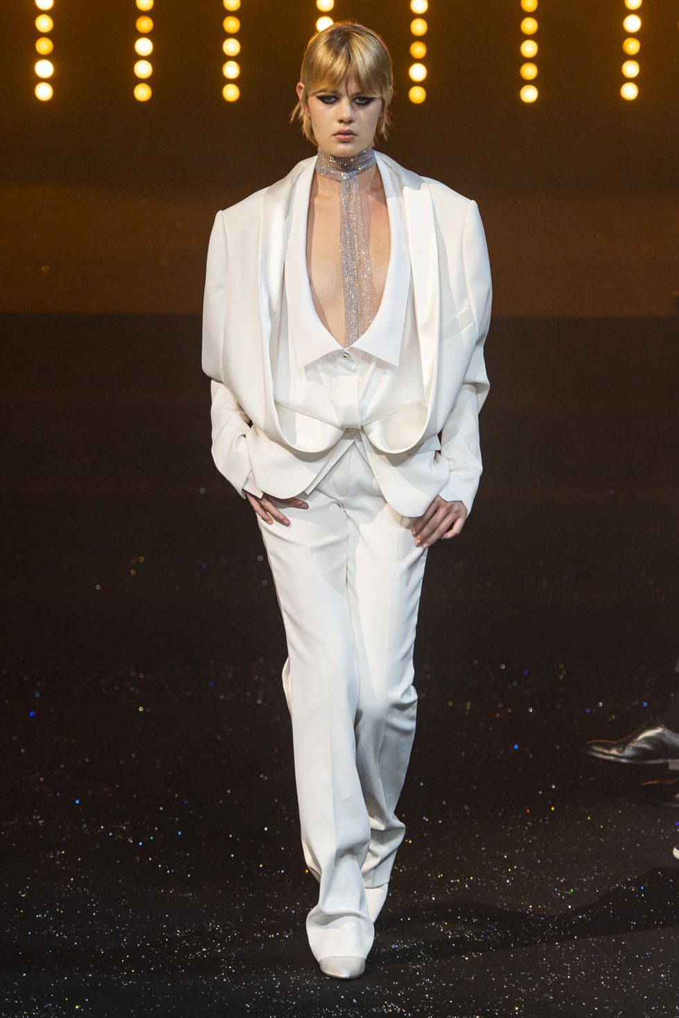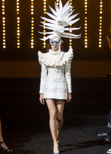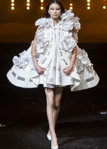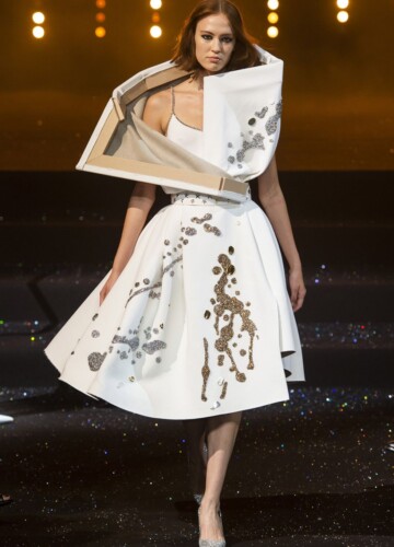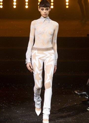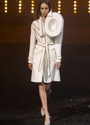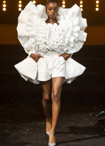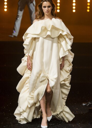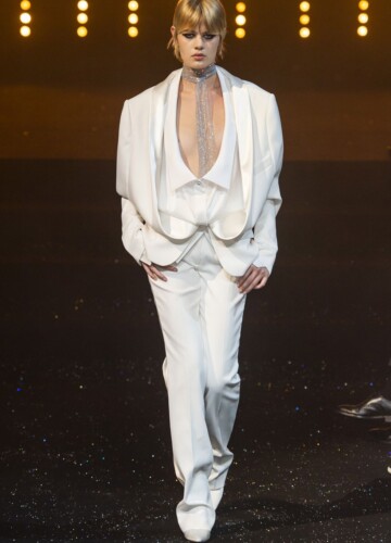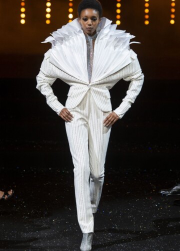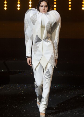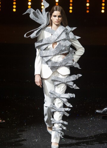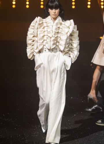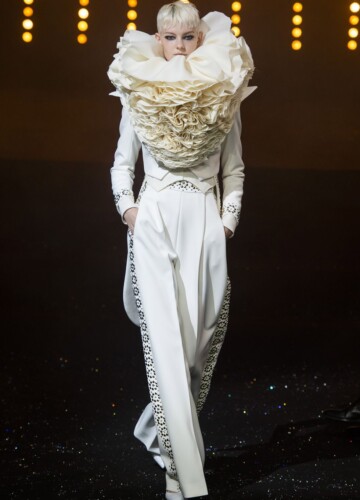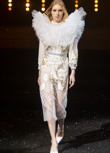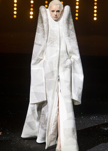 Le maniche a volta e le pieghe a fisarmonica in stile elisabettiano, indossate da alcune modelle, sembrano riportarci indietro nel tempo, mentre le enormi maniche spesse esagerate su un ultimo cappotto bianco argentato fanno sembrare chi le indossa un’arcangelo del futuro.