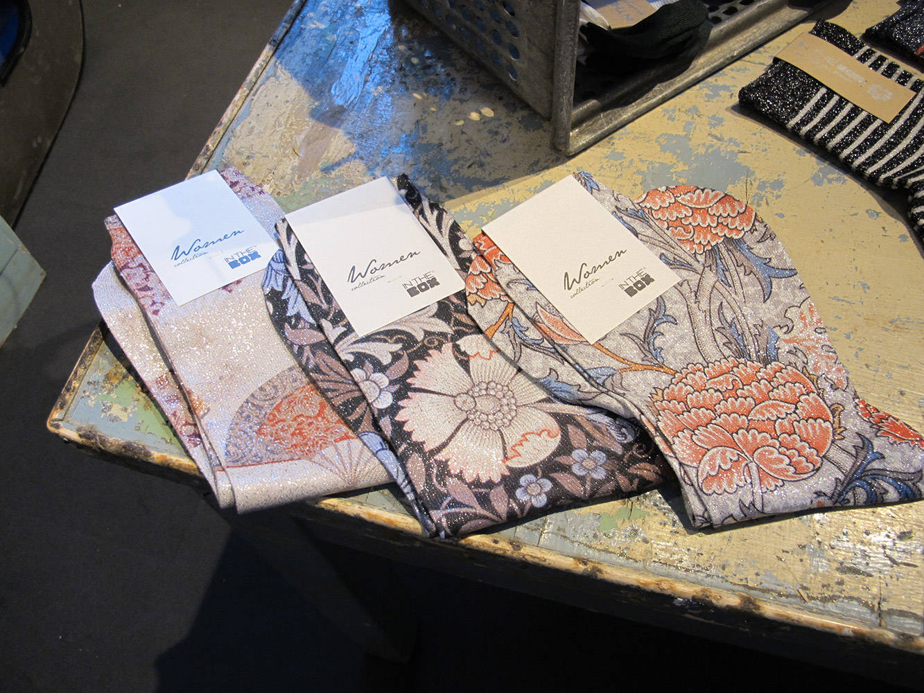 Il range di calze diventa sempre più ampio e anche i tessuti utilizzati. Abbiamo alcuni calzini resi particolarmente preziosi grazie all’utilizzo del filo in lurex che arricchisce motivi orientali e poi una nuova serie denominata ‘Hawaii’ che riprende il classico motivo floreale, che è ripreso anche sulle scatole.